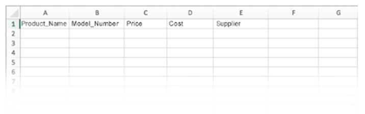 Create columns on your spreadsheet for each field that applies based on your product data. Model Number, Product Name, Price, and Supplier are required fields*